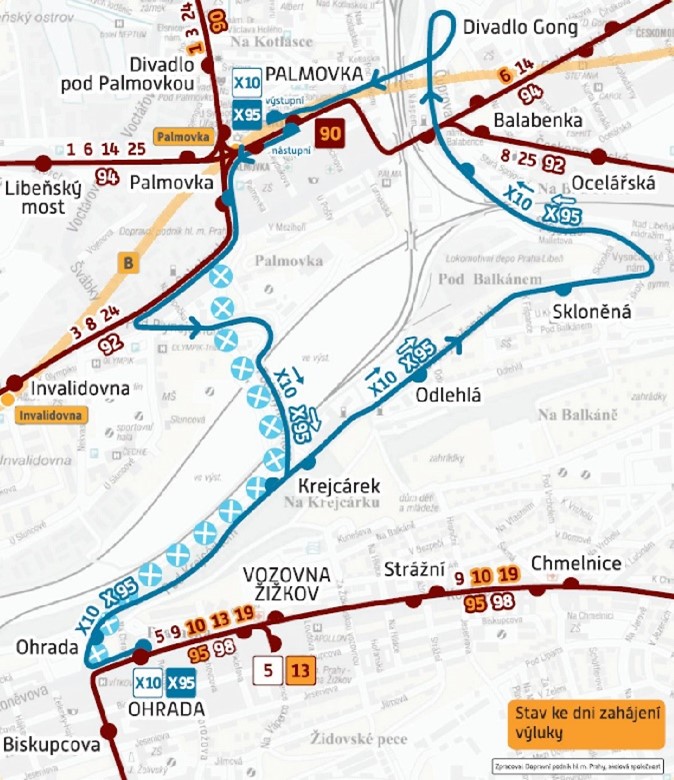 Byly zavedeny celkem tři náhradní linky. Denní X10 v trase Palmovka – Ohrada, noční X95 ve stejné trase a tramvajová linka 90 mezi Palmovkou a Kobyliskou vozovnou.